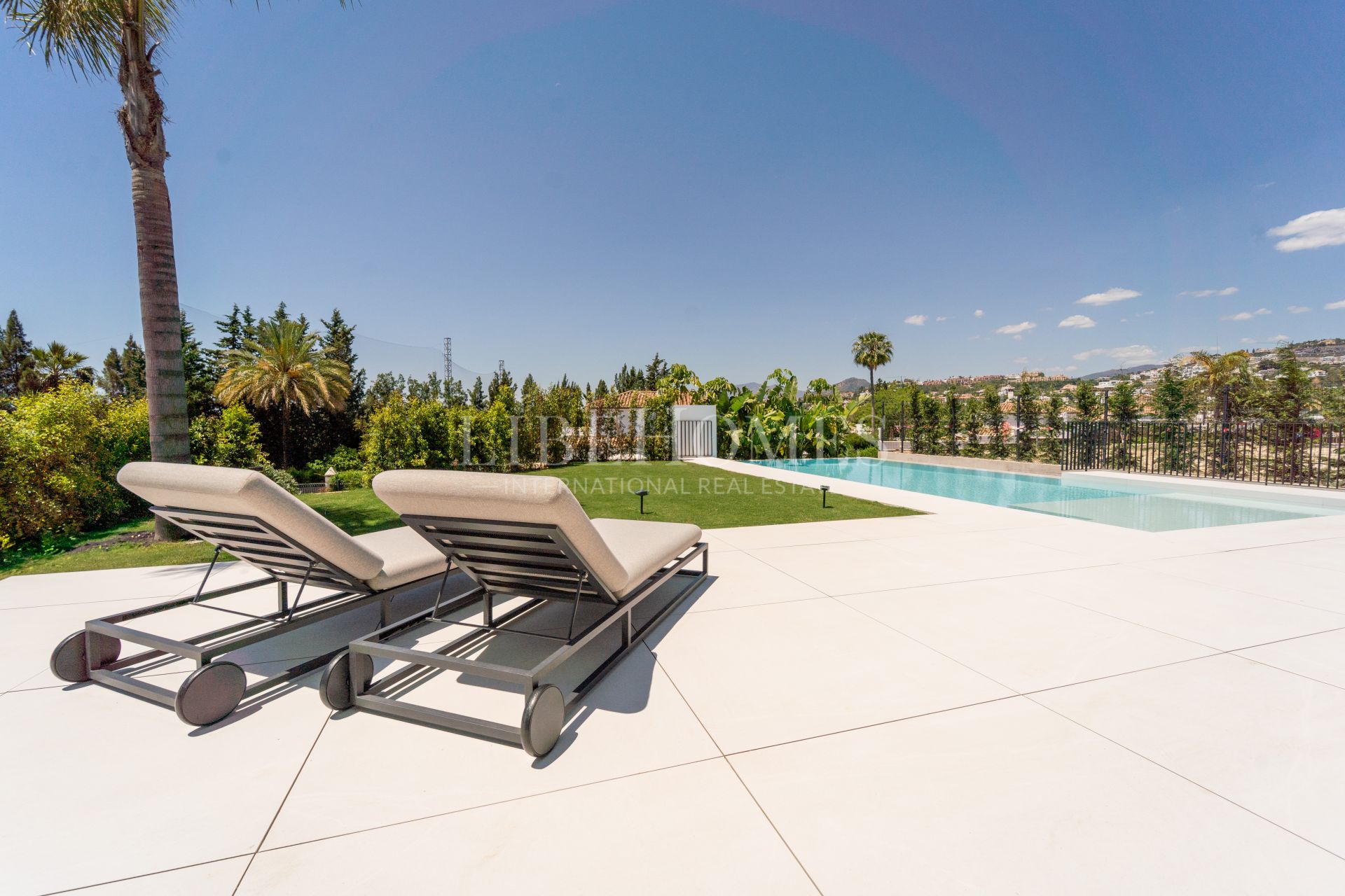 Brand-new modern villa with panoramic golf views in Nueva Andalucía, Marbella. Prime location next to Los Naranjos Golf Club and less than 10 minutes by car from Puerto Banús, the beaches, and all amenities.