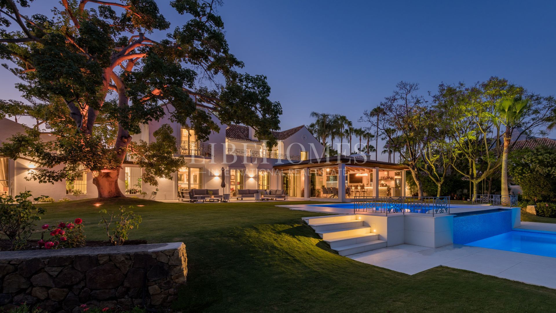 En el exterior, la villa cuenta con una gran piscina con una sección elevada y una cascada, rodeada de cuidados jardines y árboles maduros que garantizan la privacidad. Varias zonas de estar y comedor, incluyendo un patio alicatado con una fuente decorativa, invitan a disfrutar del clima de Marbella durante todo el año.